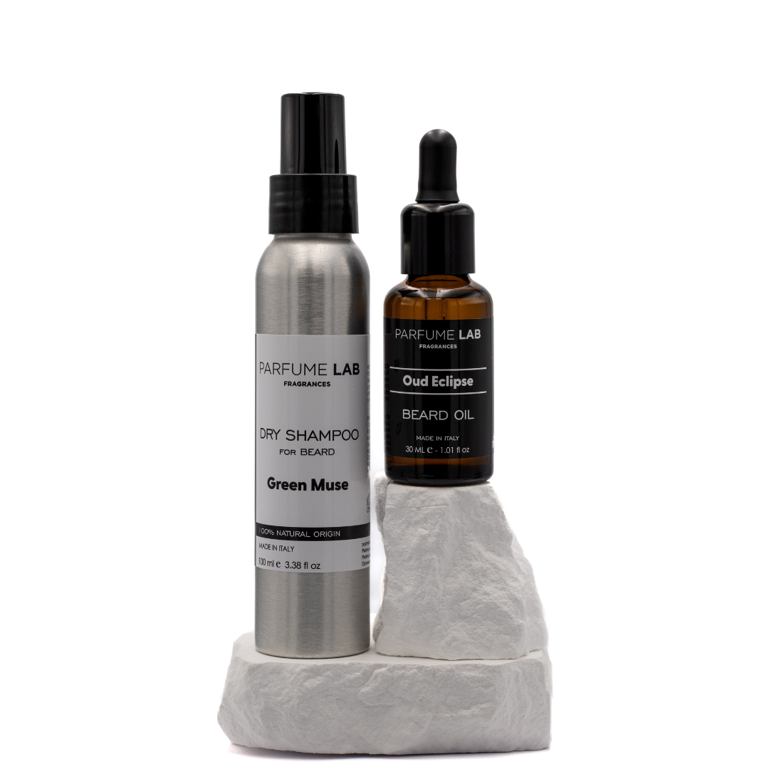 Få komplet skægpleje med vores eksklusive bundle, hvor Oud Eclipse Skægolie (30 ml) og Green Muse Dry Shampoo (100 ml) går hånd i hånd.